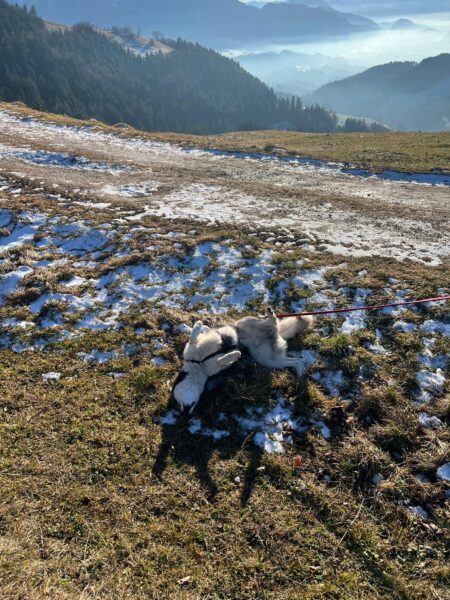 Später freute sich Kirana über einen zweiten Spaziergang mit Gunda. Die beiden fuhren nach Aschau zum östlichen Höhenweg. Kirana fand`s dort klasse, schnüffelte viel herum, freute sich über Leckerchen und genoss die gemeinsame Zeit mit Gunda. 🙂