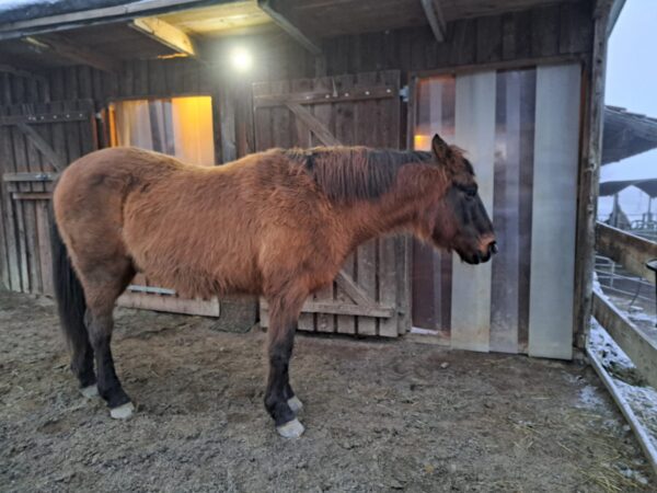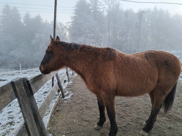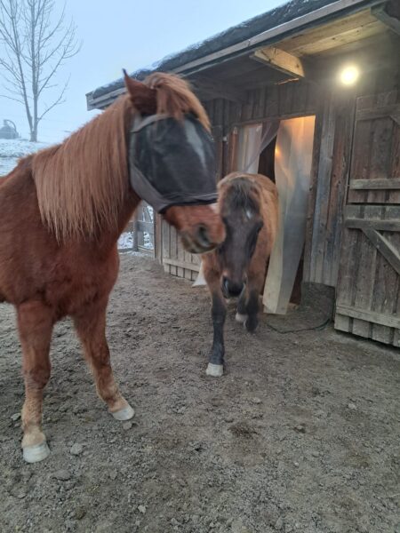 Abends war Anna Maria im Stall. Während die beiden ihr mit warmen Wasser angemachtes Müsli fraßen, mistete Anna Maria aus und legte Heu nach. Diesmal eine etwas größere Portion, denn auf der Weide unter dem Schnee finden die Pferde nur noch wenig Gras und bei der Kälte brauchen sie etwas mehr „Reserve“ beim Gewicht. Anschließend verabschiedete sie sich von Wallace und Gowinda und fuhr wieder. 🙂