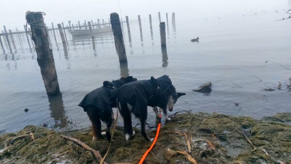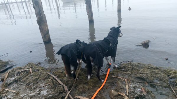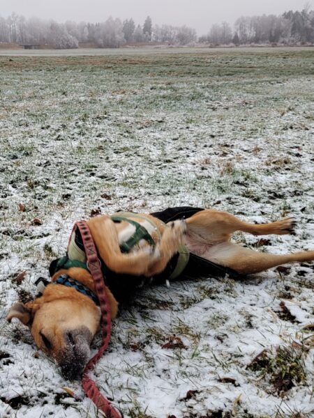 Momo und Aika waren mit Renate und Gunda in Richtung Übersee unterwegs. Am Chiemsee schnüffelten sie entspannt im Uferbereich herum und freuten sich über Leckerliesuchen. Aika wälzte sich übermütig im Schnee und hatte eine Mordsgaudi dabei – schön war`s. 🙂