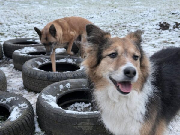 Jutta und Matthias fuhren mit Rosalie, Lucky und Balto zum Hundeplatz, wo Rosalie und Lucky herumflitzten und Balto in seinem gemütlichen Tempo hinterher schnüffelte. Bei den Reifen trafen sich die drei zur Leckerchensuche, dann gingen sie über einige der Geräte. 🙂