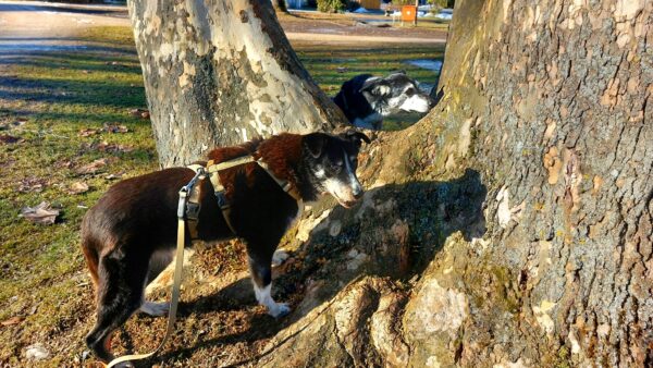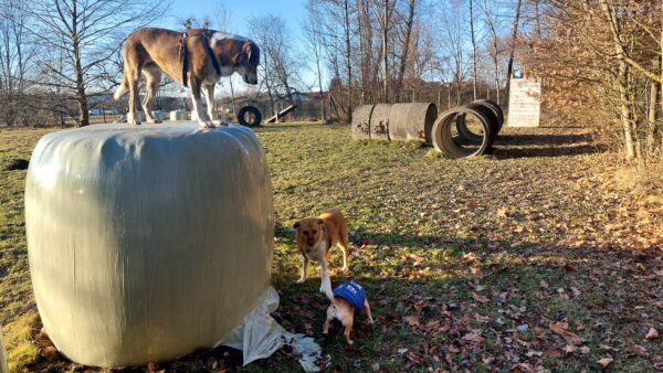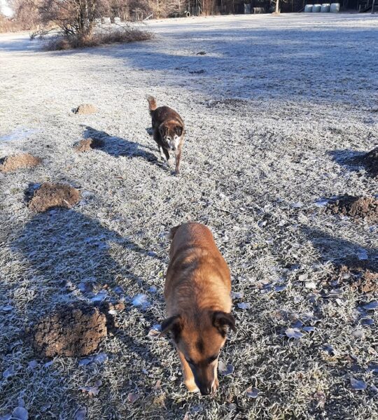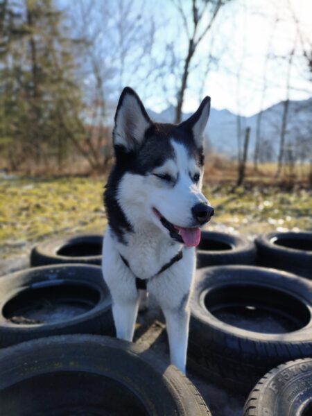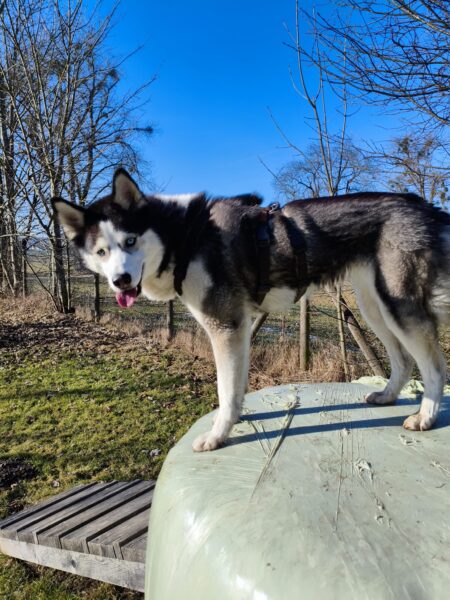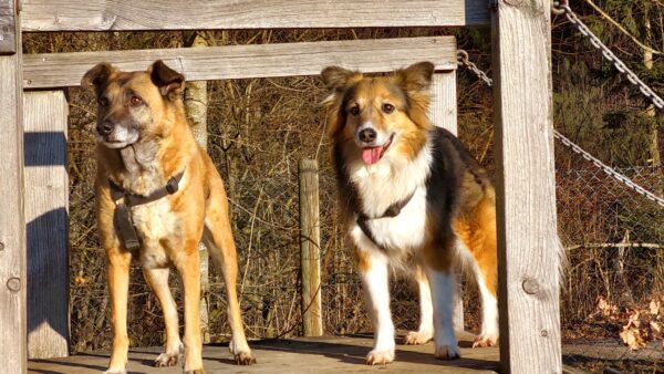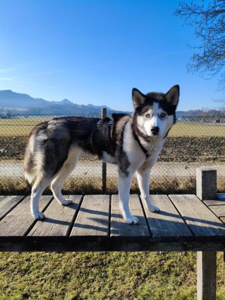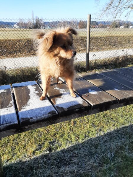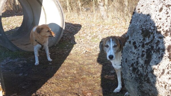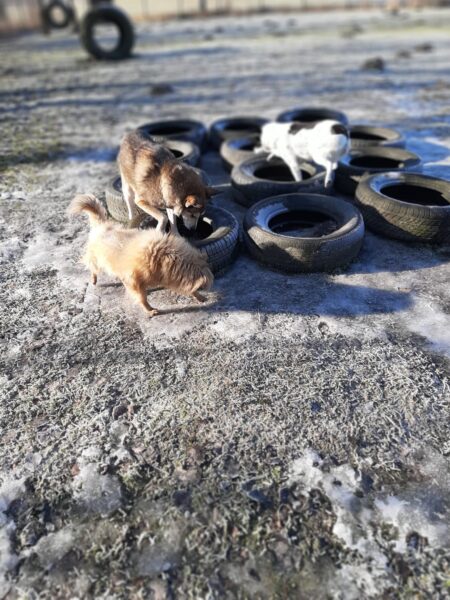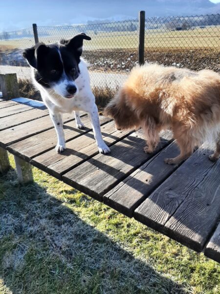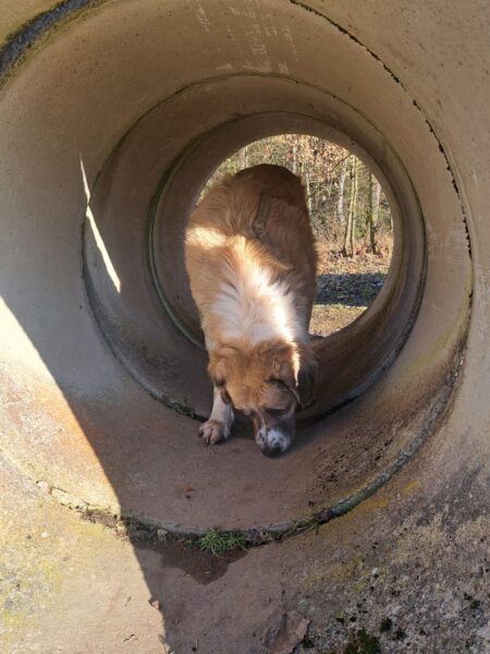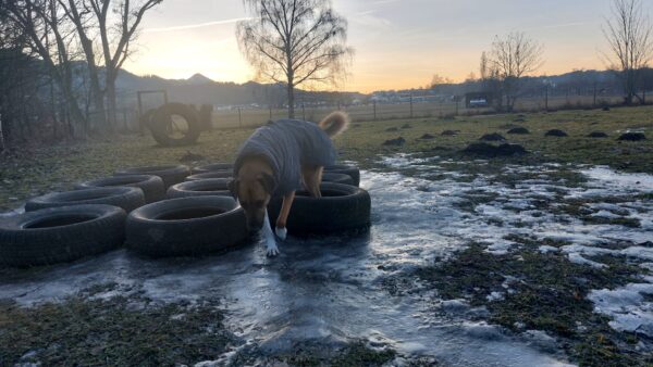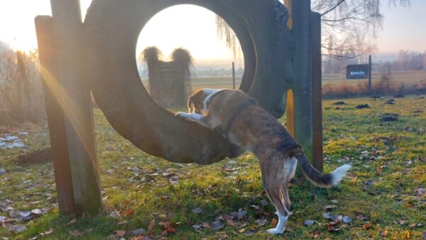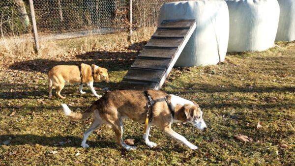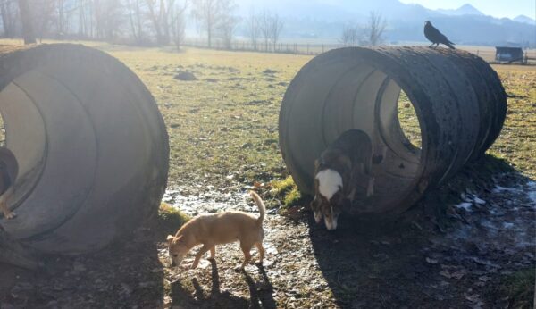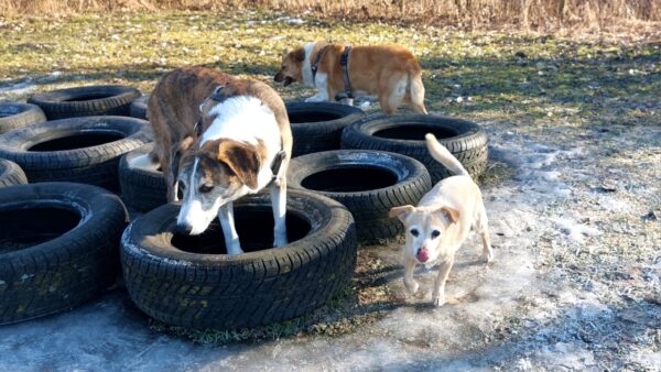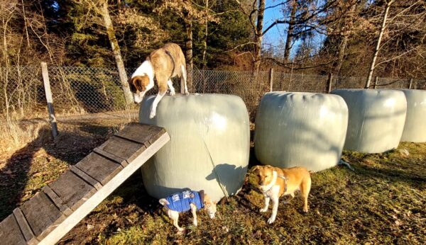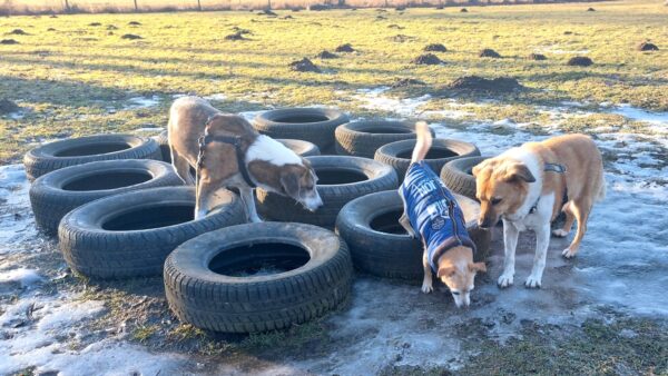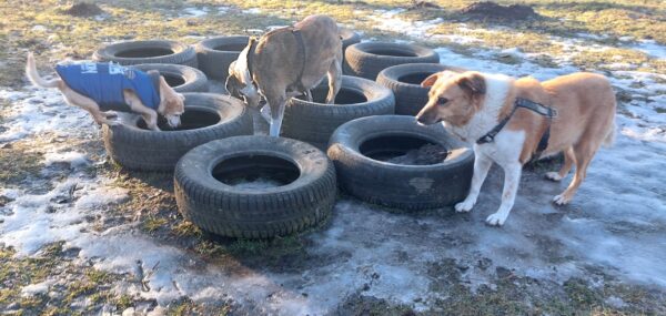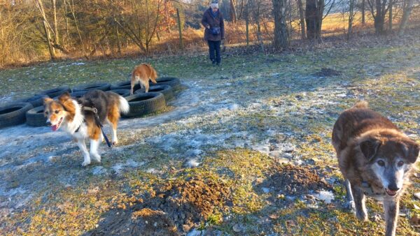 Rosalie, Lucky & Balto waren mit Conny und Elfriede auf dem Hundeplatz. Bei strahlendem Sonnenschein war ziemlich viel los auf dem Bachweg, so dass es für die drei viel zu schauen gab. Lucky und Rosalie waren auf den Geräten unterwegs, Balto schnüffelte zufrieden am Zaun entlang. Bei den Reifen gab es eine Leckerliesuche, die alle drei ruck-zuck einsammelten und danach gingen alle noch draußen spazieren, was vor allem Rosalie immer total super findet. Sie flitzte mit einem breiten Lachen über die Wiesen. 🙂