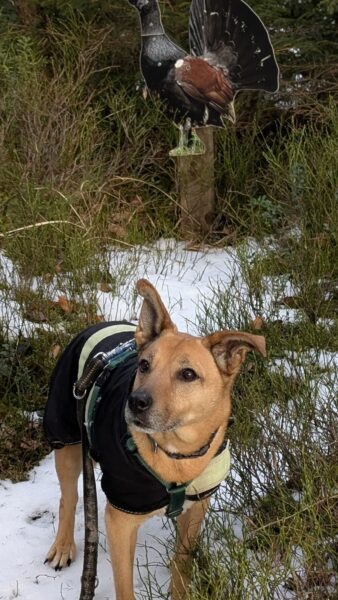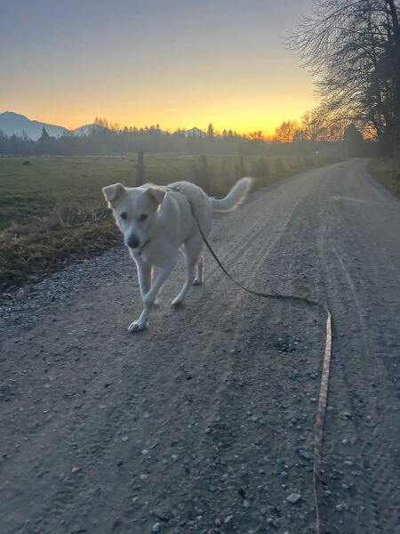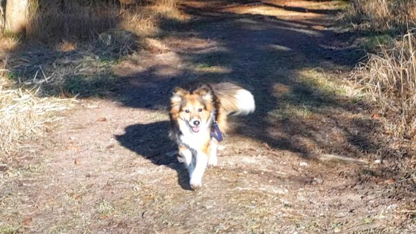 Die beiden gingen dann noch einen Feldweg entlang, dort schnüffelte Kirana viel am Wegesrand und freute sich, dass sie dabei Leckerchen fand, die Carsten für sie ausgelegt hatte. 🙂