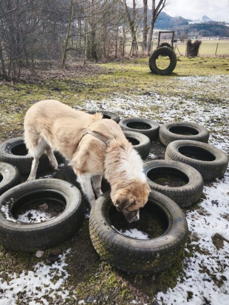 Als Carsten vormittags kam, fuhr er mit Aslan zum Hundeplatz. Der stand schon voller Vorfreude an der Tür und begrüßte Carsten freudig. Aslan genoss den Ausflug sehr, war recht aktiv und schnüffelte neugierig kreuz und quer über das Gelände. An den Reifen suchte er nach den ausgelegten Leckerlies, danach war Ausruhen angesagt, wobei er aufmerksam die Umgebung im Blick behielt und sich gerne von Carsten streicheln ließ. 🙂