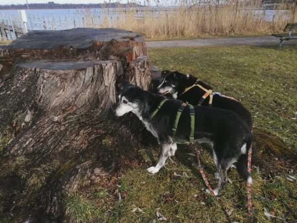 Mit Momo ging Gunda auf die große Wiese und zum kleinen See dahinter. Momo freute sich sehr, schnüffelte viel und fanden mit Gunda einen Pfad quer durch den Wald, den sie mega interessant fand. Dank Gunda`s guter Orientierung und Momo’s guter Nase kamen sie an den Weihern wieder raus und gingen den normalen Weg zurück. 🙂 Danach ging Gunda mit Aika spazieren. Aika nahm sofort die Spur von Momo auf und so gingen die beiden exakt die gleiche Strecke. Was für eine tolle Nase Aika hat. 😊 Für Gunda war das total interessant und Aika war mega beschäftigt, der Spur ihrer Schwester zu folgen…. sooo schön! 😊