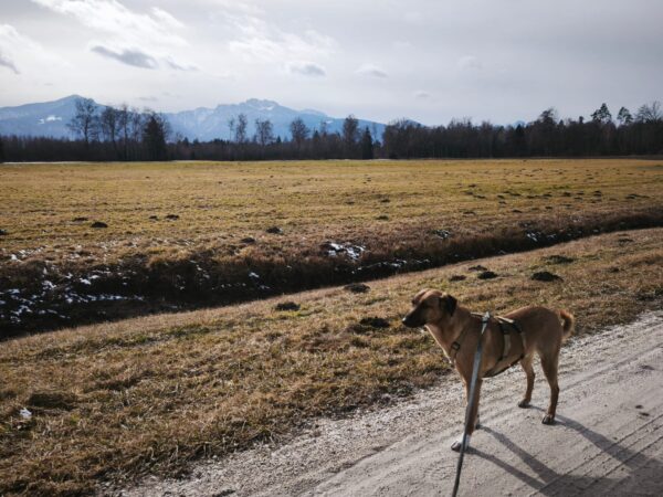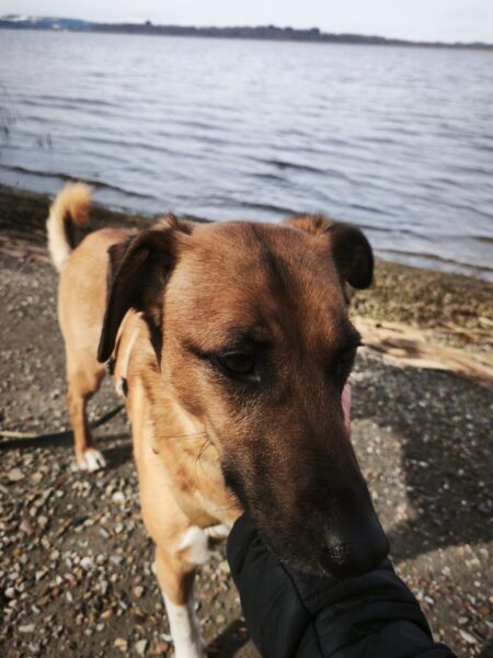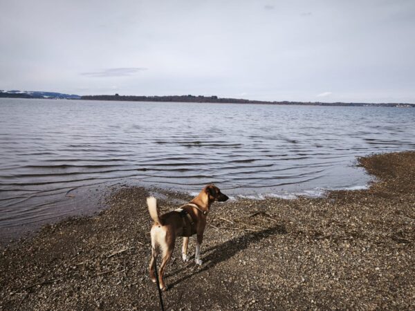 Auch Sam freute sich über einen schönen und sonnigen Mittagsspaziergang. Carsten ließ ihm die Wahl, ob er vom TierHeim aus laufen oder ins Auto einsteigen wollte und Sam lief entspannt, aber zielstrebig an Carsten´s Auto vorbei. Auch die große Wiese ließ er rechts liegen und so gingen sie weiter bis zum Chiemsee. Am Ufer schnüffelte Sam ruhig herum, ließ sich gerne streicheln und freute sich über Leckerchen. Beide genossen die entspannte Stimmung. 🙂