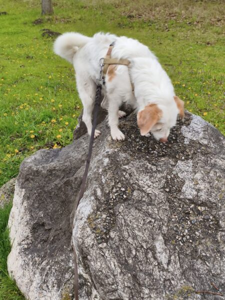 Danach fuhr Anna Maria mit Sam nach Rottau zum Tennisplatz und ging mit ihm von dort aus auf den Waldtiererlebnispfad. Auf dem Pumptrack waren zwei kleine Kinder auf ihren Fahrrädern rasant unterwegs, in Begleitung von einer Frau. Sam blieb von Beginn an ruhig bei Anna Maria und guckte sich die Situation an. Auf dem Weiterweg drehte er sich mehrfach um, um nochmals zu schauen. Schließlich ging er seiner Wege, schnüffelte herum, freute sich über Leckerchen und die Bewegungsfreiheit, die ihm die 10 Meter lange Schleppleine bot. 🙂