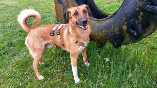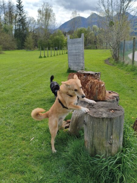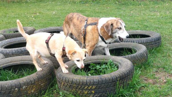 tollten zwischendurch fröhlich herum, wälzten sich wohlig im Gras, hatten richtig Spaß an den Pfötchentricks und erkundeten einige der Geräte, vor allem während der Leckerliesuche an den Reifen – so ein Spaß! Fio wollte öfter gekrault werden und lehnte sich dabei ganz dicht an Conny – so lieb! Es war ein wunderschöner und entspannter Ausflug für alle. 🙂