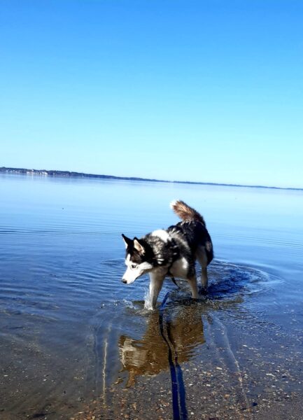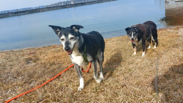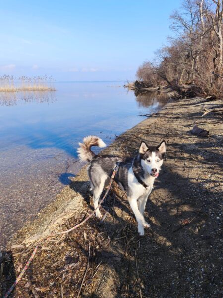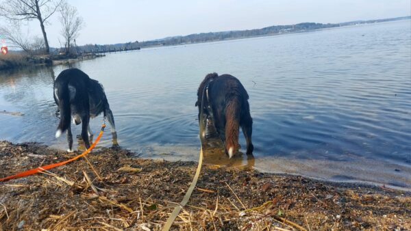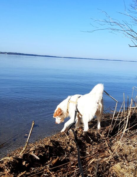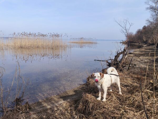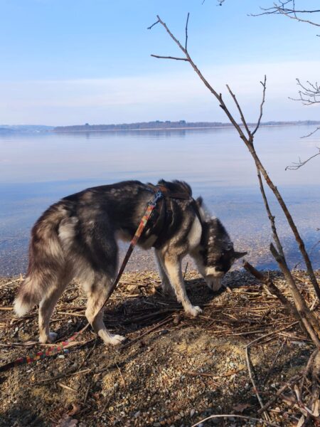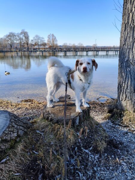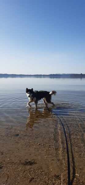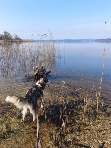 Peter und sein Sohn waren nachmittags lange mit Kirana am Chiemsee spazieren. Kirana freute sich über den Ausflug, schnüffelte viel herum, plantschte im Wasser und freute sich über Leckerchen. 🙂 Zur Nachmittagsfütterung kamen alle drei zufrieden und gut gelaunt zurück und Kirana bekam gleich ihr Futter. 🙂