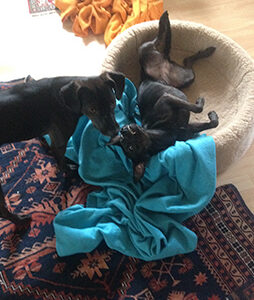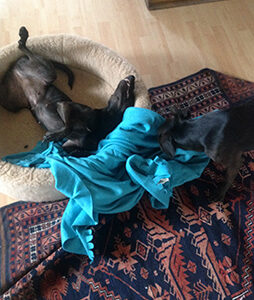 den Mädels geht es richtig gut. Unser Schlafzimmer wurde im Sturm erobert, ab jetzt sind wir zu viert im Bett. Das Körbchen im Schlafzimmer ist schon ordentlich ramponiert. Die Treppen rauf und runter sind auch kein Problem mehr. Wir sind sehr glücklich mit den beiden.