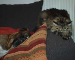Manchmal muss Rosa sich schon einen anderen Schlafplatz suchen, da ihr Kissen in Beschlag genommen wurde, aber auf der Couch gefällt es ihr denke ich auch ganz gut! Ansonsten zwickt sie sich einfach dazu, wie ihr auf einem Foto sehen könnt.