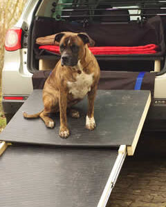 Hier noch unsere neueste Anschaffung, nachdem mein Auto ja so hoch ist und Rosa wegen ihrer Gelenke nicht springen darf. Herzlichen Dank an dieser Stelle noch einmal an Herrn Spärer, der sich dieser Maßanfertigung angenommen hat! Rosa hat die Rampe vom ersten Tag an akzeptiert und kann jetzt wieder alleine ins Auto und wieder raus. Hätte ich sie weiterhin heben müssen, wäre wohl auch ich Dauerpatient beim Physiotherapeuten geworden…