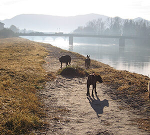 Beim Spazierengehen läuft sie schon die meiste Zeit ohne Leine. Nur dort wo Katzen unterwegs sind muss ich sie manchmal einbremsen. Wobei auch die Nachbarskatzen schon neugierig stehen bleiben und ganz interessiert gucken. Die haben schon gemerkt, dass Rosa nicht angreifen würde, da sie auf Kommando brav weiter geht. Hundekumpels hat sie auch schon gefunden, die treffen wir auch täglich wenn wir unterwegs sind. Lucky ist eine weiße Schäferhündin, mit der sie sich gut versteht, wobei die beiden Mädels, wenn sie alleine sind, meistens mit Löcher buddeln beschäftigt sind. Die beiden Jungs Joey (Magyar Vizsla) und Nugget (Labrador) bringen dann doch ein bisschen mehr Power mit! Da wird dann über die Wiesen geflitzt und getobt, zur Abkühlung geht’s dann anschließend in die Mangfall! Dann haben alle ein breites Grinsen im Gesicht und sind froh, wenn sie sich daheim wieder ein bisschen ausruhen können.