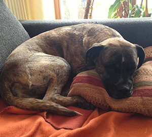 In der Wohnung ist sie inzwischen total entspannt und lässt sich auch von diversen Alltagsgeräuschen nicht mehr aus der Ruhe bringen.