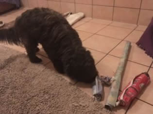 Giza hat Michi am Nachmittag im Hof Gesellschaft geleistet und sie bei der Arbeit begleitet. Neugierig schnupperte in jedes leere Zimmer ab, das Michi putzte. Bei Georgie im Zimmer hat sie dann endlich gefunden, was sie gesucht hat: Sie hat sich eines seiner Kuscheltiere geschnappt und ist damit zurück zu ihrem Zimmer gerannt um es zu ihren anderen Tieren zu packen und dort zu sichern. ![]()