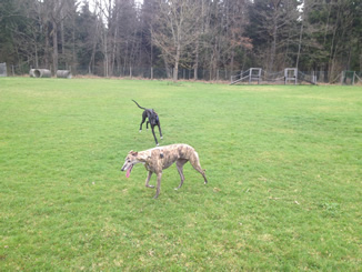 Murphy, Nicky und Laluna waren in Spiellaune. Sie tobten durch den Auslauf und lieferten sich ein Rennen nach dem anderen. Wenn Murphy so ausgelassen tobt, könnte man meinen, er wäre noch ein Junghund.