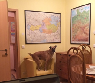 Am Abend kam Gabi zu Besuch, um uns ein paar Tage tatkräftig zu unterstützen. Alle haben sich riesig gefreut, vor allem aber Donna, die so sehr nach Streicheleinheiten gebettelt hat, als würde sie von uns nie welche bekommen. Sie wollte nicht einmal zurück ins Zimmer und legte sich auf den Rücken auf die Couch im Hof, um weiter gekrault zu werden, was wirklich sehr niedlich war. ![]()